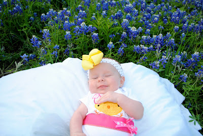 This morning we woke up and I feed Miss H then threw (not really) her in her car seat. I rushed us over to the bluebonnet spot. The rush was all because it was overcast. You see it was bright enough for the pictures, but not too bright that she would not open her eyes. I took probably a thousand pictures...to only have like 10 turn out good. Thank you for digital cameras! But I am pleased with our impromptu photo session. Here are the good ones. We are going to try again later this week, you know me always looking for perfection! HA Ready for picture overload?