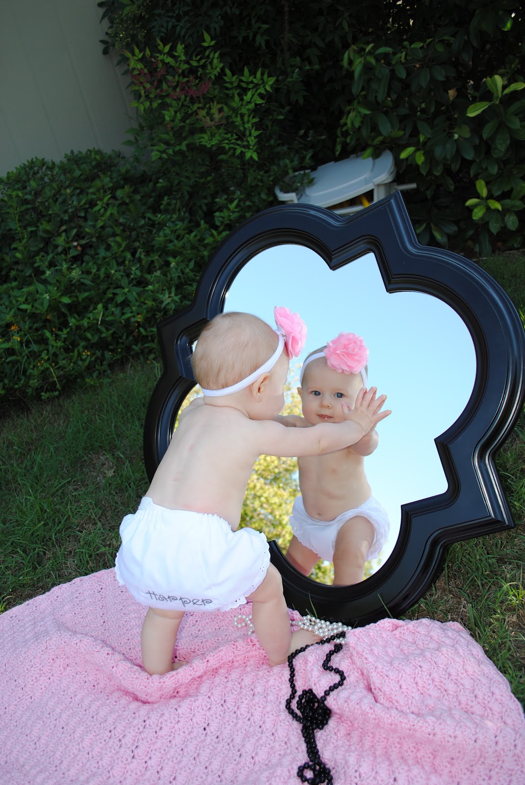 I saw this cute idea on pintrest of course and have been wanting to try it. I finally got my self motivated and did it. Really it was a matter of getting a cute mirror and such. However, I pretty much love how it turned out. I just wish she would have given me a few more smiles..but she was way to busy checking things out!